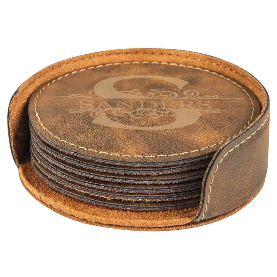 4" Round Leatherette Coasters 6 Piece Set - Monogram Name