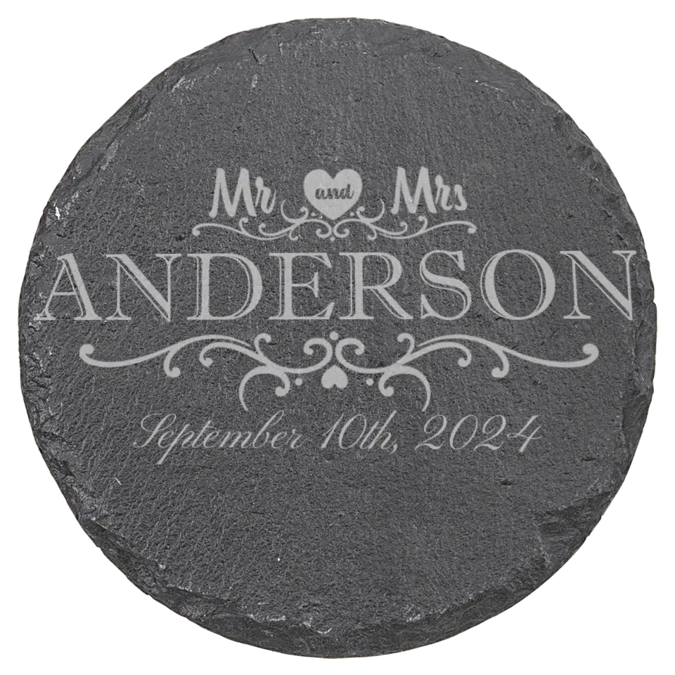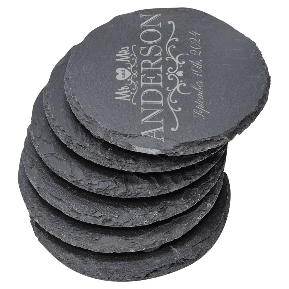 4" Round Slate Coasters 6 Piece Set - Heart Mr & Mrs With Date